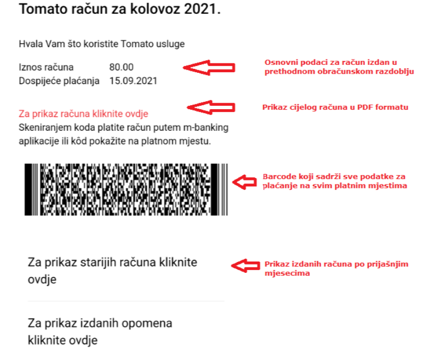 - Pošalji SMS na broj 13036 s e-mail adresom (npr. test@tomato.hr) na koju želiš primati e-račun